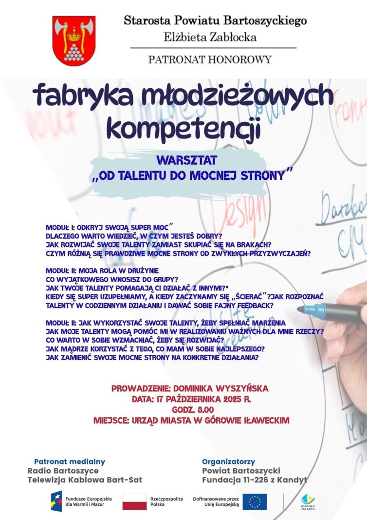 Warsztaty odbędą się już w najbliższy piątek 17 października w Urzędzie Miasta w Górowie Iławeckim. To będzie doskonała okazja dla młodzieży, by zrozumieć swoje naturalne talenty i przekuć je w świadome kompetencje.