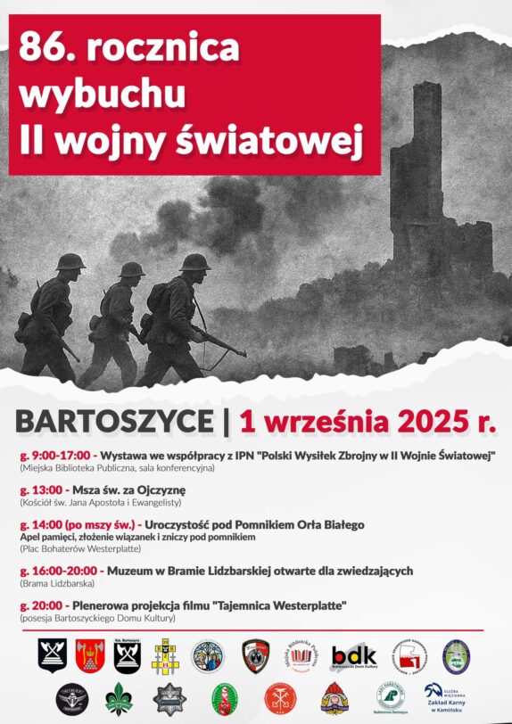 Zapraszamy mieszkańców Powiatu Bartoszyckiego do włączenia się w wydarzenia związane z upamiętnieniem wybuchu II wojny światowej oraz uczczeniem pamięci ofiar, które pochłonął ten największy konflikt zbrojny w historii.