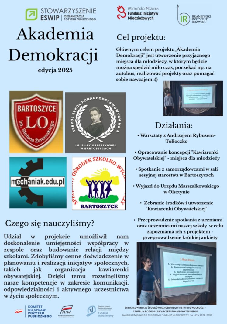 W sali sesyjnej Starostwa Powiatowego w Bartoszycach oficjalnie zakończył się 3 miesięczny projekt „Akademia Demokracji”, którego celem było podniesienie kompetencji obywatelskich wśród młodzieży Powiatu Bartoszyckiego.