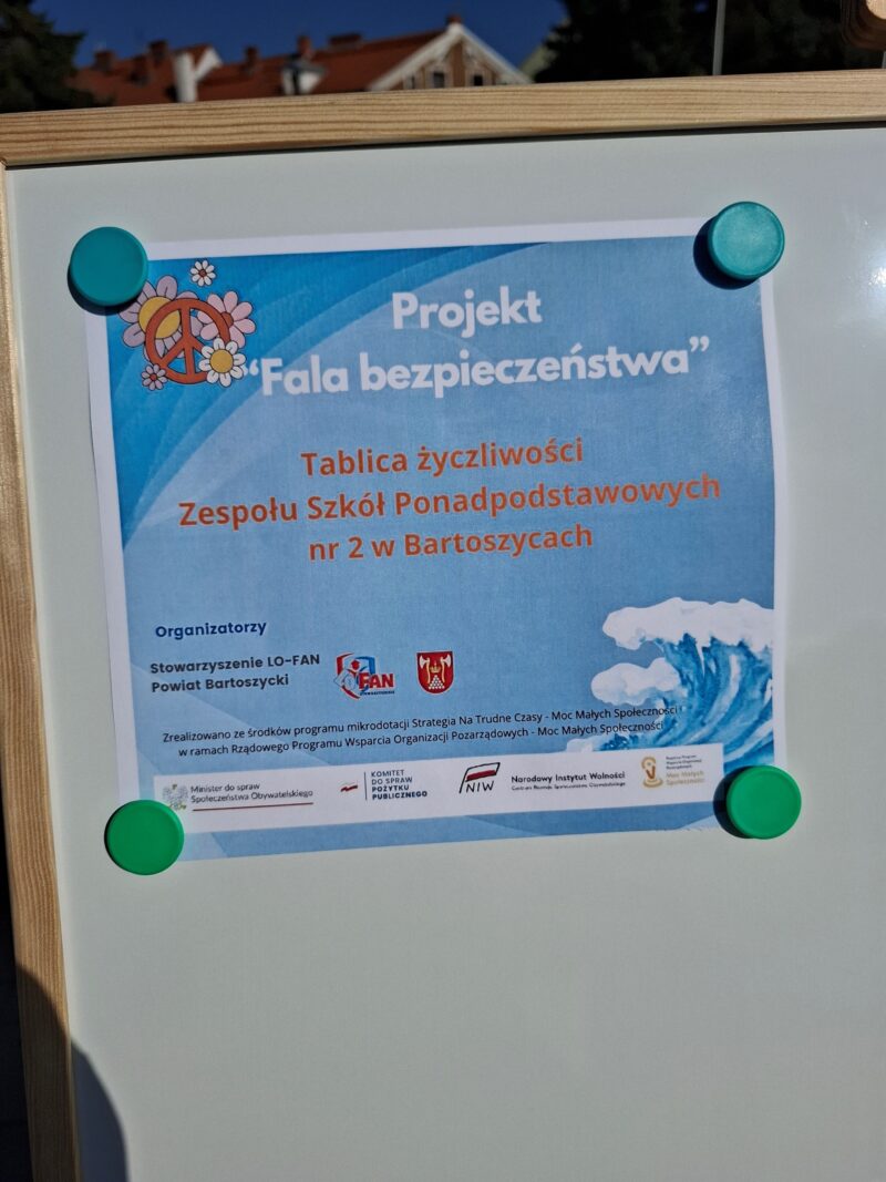Projekt „Fala bezpieczeństwa” zrealizowano ze środków programu mikrodotacji Strategia Na Trudne Czasy – Moc Małych Społeczności w ramach Rządowego Programu Wsparcia Organizacji Pozarządowych – Moc Małych Społeczności.