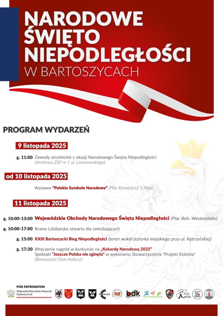 W imieniu Wojewody Warmińsko-Mazurskiego, Starosty Powiatu Bartoszyckiego, Burmistrza Miasta Bartoszyce oraz Wójta Gminy Bartoszyce serdecznie zapraszamy do udziału w Wojewódzkich Obchodach Narodowego Święta Niepodległości, upamiętniających 107. rocznicę odzyskania wolności przez Polskę.